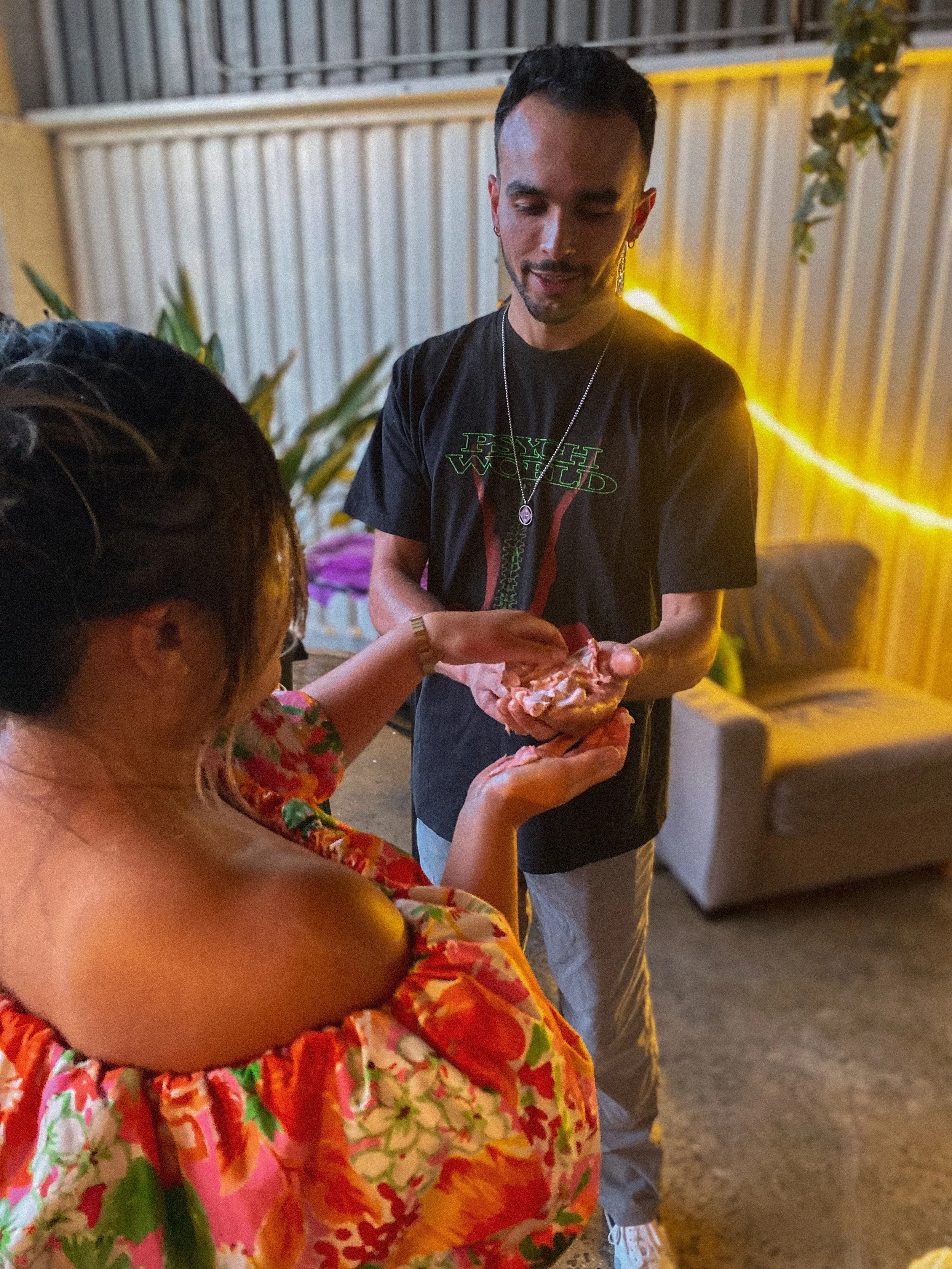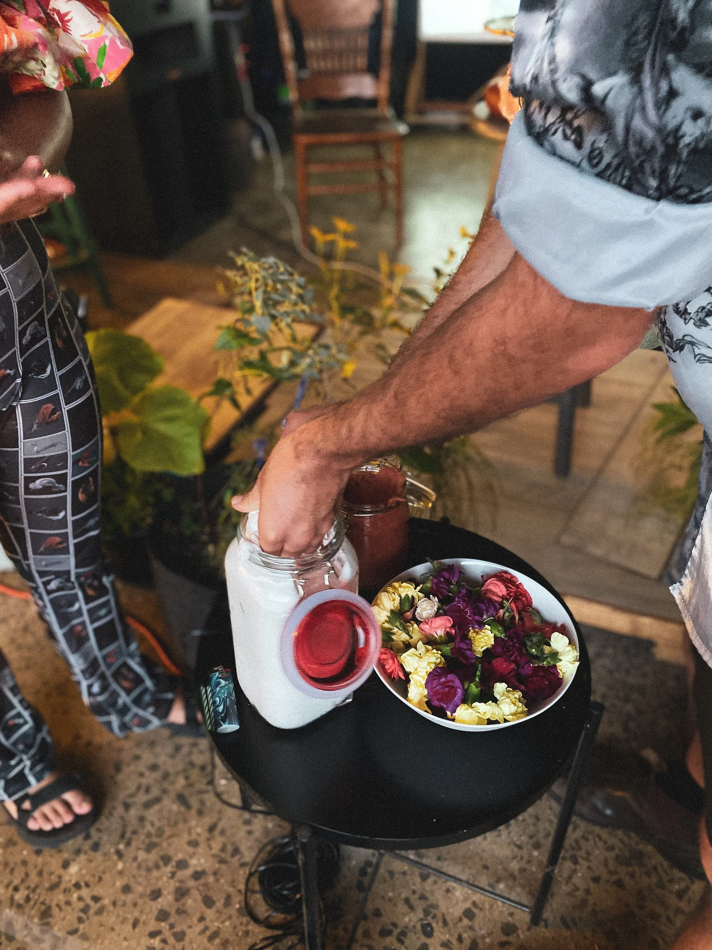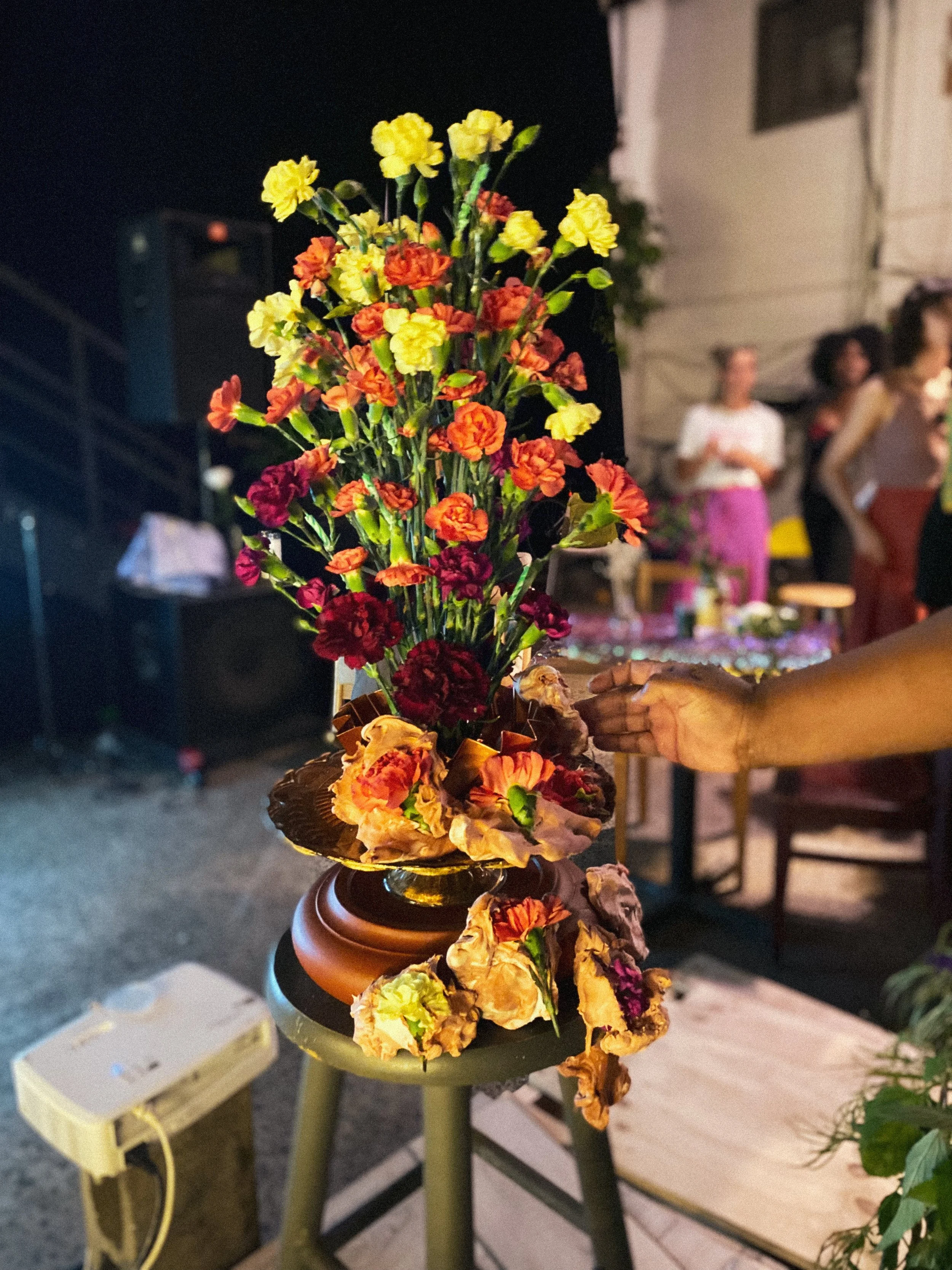 Burn Bouquet: Participants are invited to make a wish and blow out a candle on a generative community sculpture of carnations, beeswax candles, clay, copper cake mould, and cake stand. It’s giving the nostalgic glimmer of birthday wishes and bouquets received from loved ones after the school play.
