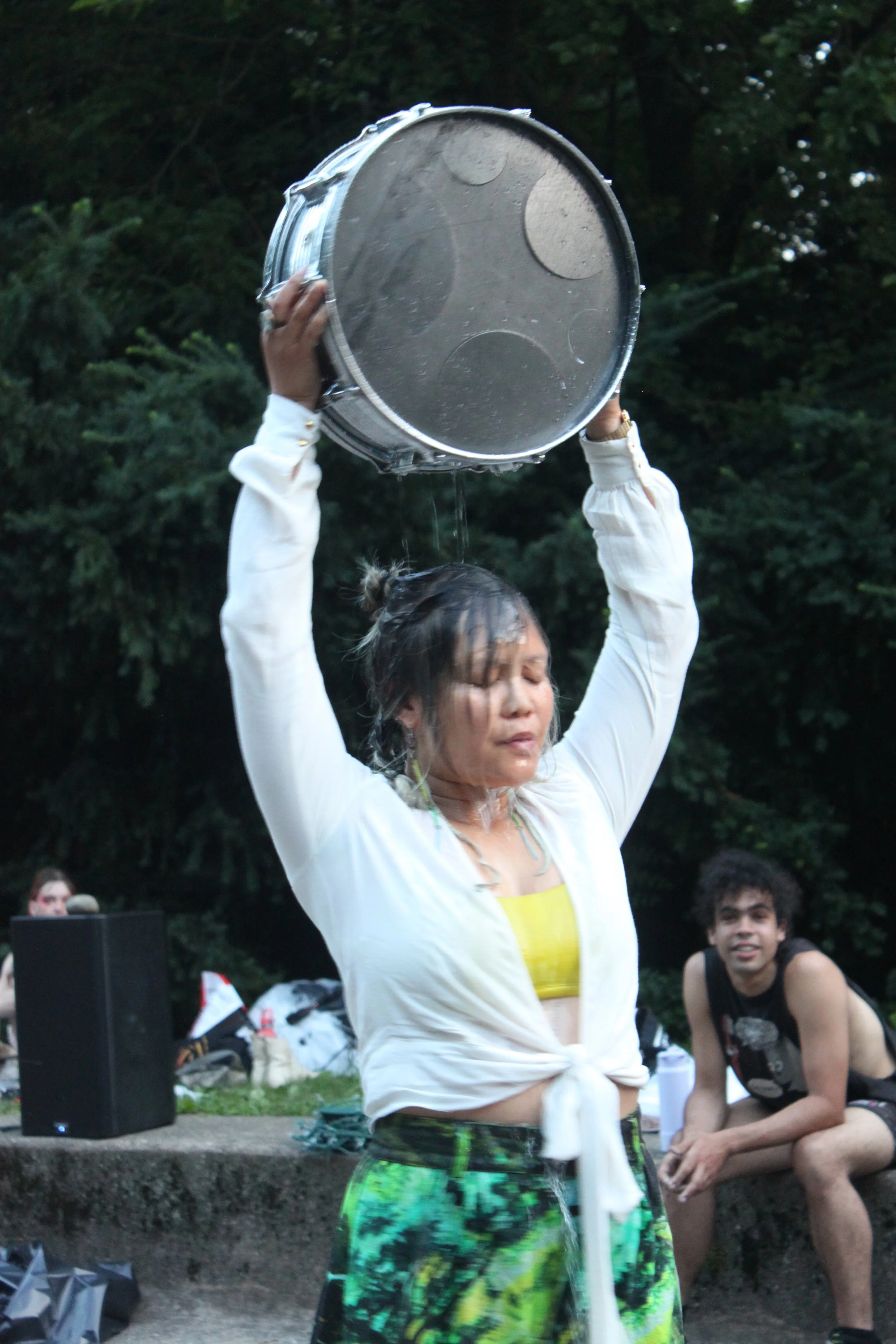 Rain Drum: The artist waters a drum tongue drum as tribute to the rain, finishing by watering themself.