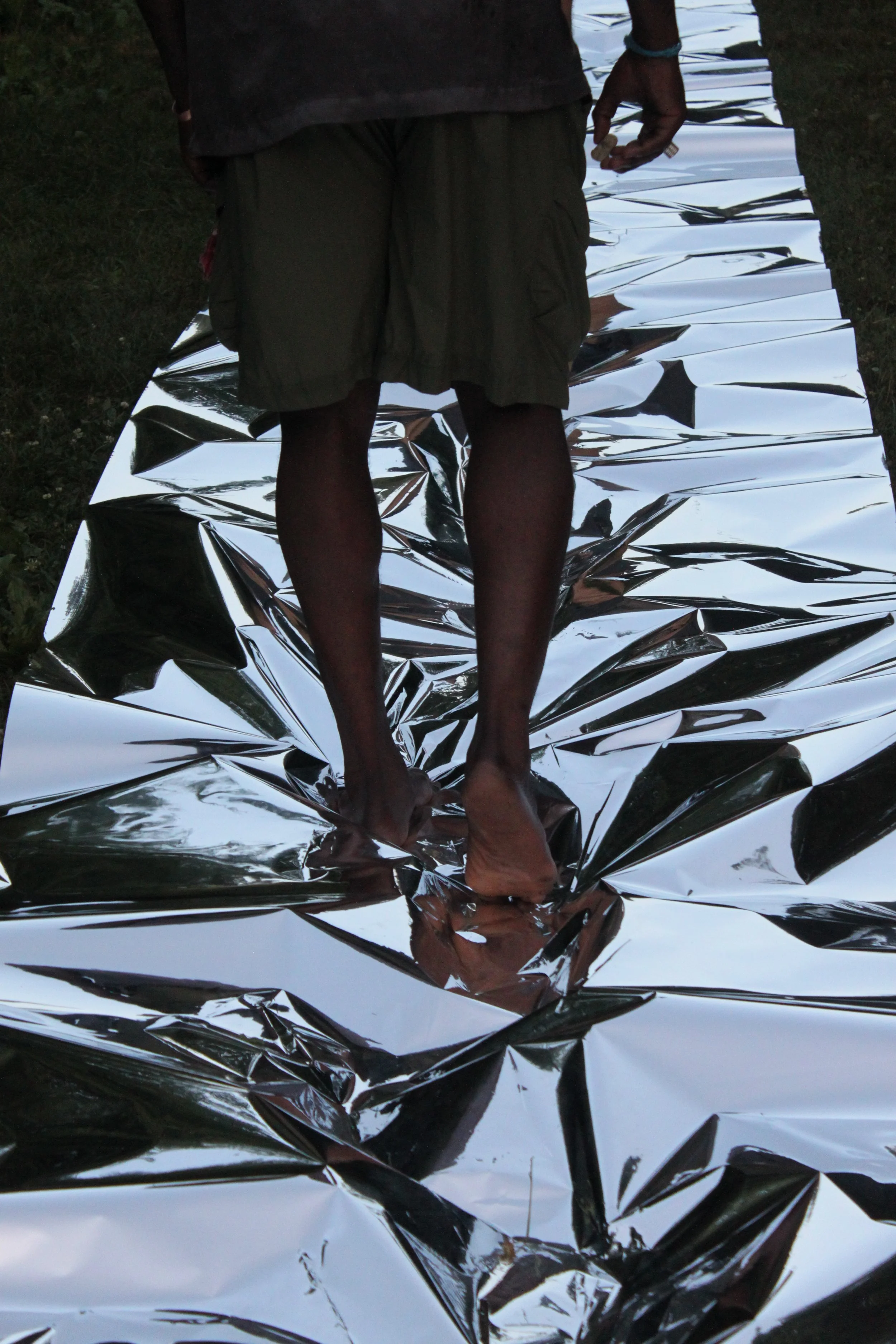Reflection Procession: Participants slowly walk a mylar pathway set in a green space. PROMPT: tread lightly. gaze down at the distortions in your reflection pressed by your weight and force unto the earth. gaze forward out at the horizon. and gaze upward at the sky.